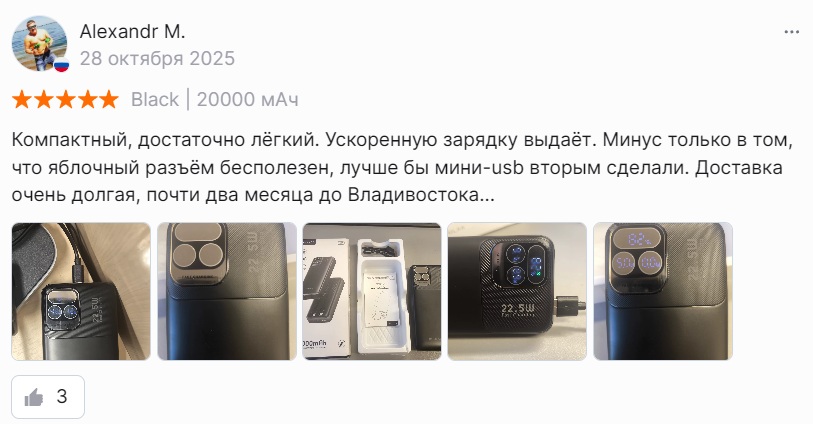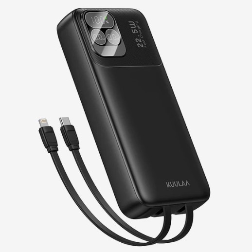 Интересная модель со встроенными зарядными кабелями - очень удобно. У него ёмкость 20 000 мАч, мощность 22.5 Вт + поддержка быстрой зарядки. Не нужно таскать провода отдельно: прямо в корпус встроены кабели Type-C и Lightning - подойдёт и для новых айфонов, и для большинства андроид-устройств. Плюс есть дополнительные порты Type-C и USB, так что можно заряжать несколько гаджетов одновременно. На корпусе цифровой дисплей - видно, сколько заряда осталось. Хороший вариант для путешествий или просто на каждый день.