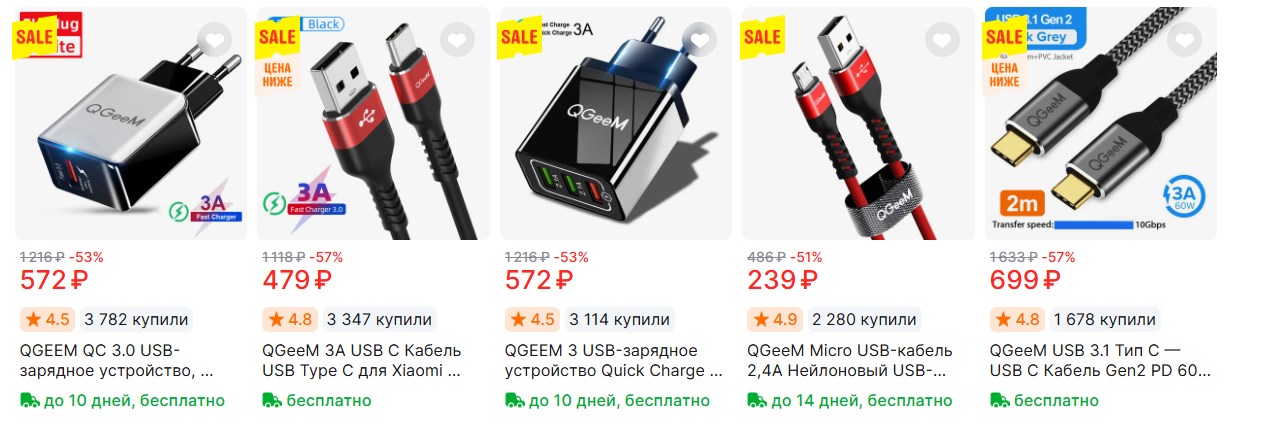 Мужики, кому нужны зарядки и кабели по нормальным ценам - на Алике у QGEEM сейчас выгодно. Доставка быстрая, цены приятные. Пробежался по каталогу: