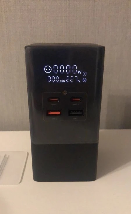 Представляет собой удлинитель с 3 розетками на 220 В и зарядное устройство в одном корпусе. Размер 129х66х66 мм, 2 Type-C и 2 USB порта суммарной мощностью 35 Вт, номинальная мощность розеток 4000 Вт, цифровой дисплей показывает текущую нагрузку.
