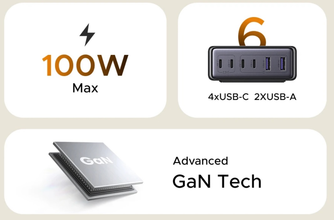 100 Вт суммарной мощности и поддержка быстрой GaN заряки. 4 порта Type-C и 2 порта USB-A позволяют одновременно заряжать до 6 устройств (ноутбук, смартфоны, часы и другое).