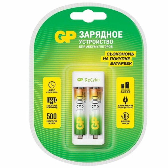 Зарядное устройство GP на 2 слота, в комплекте два аккумулятора АА на 1300 mAh. С низким саморазрядом - лежат годами, заряд не теряют. Для пультов, часов, фотоаппаратов, детских игрушек - самое то. Зарядка автоматическая, не перегревает, с индикацией.