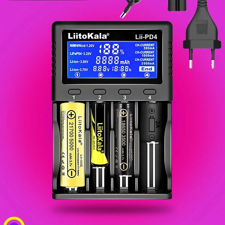 Универсальное зарядное устройство на 4 независимых слота. Подходит для зарядки большинства популярных типов аккумуляторов (Li-ion, Ni-MH, Ni-Cd и других) и форматов от небольших AAA и 10440 до крупных 26650 и 21700.