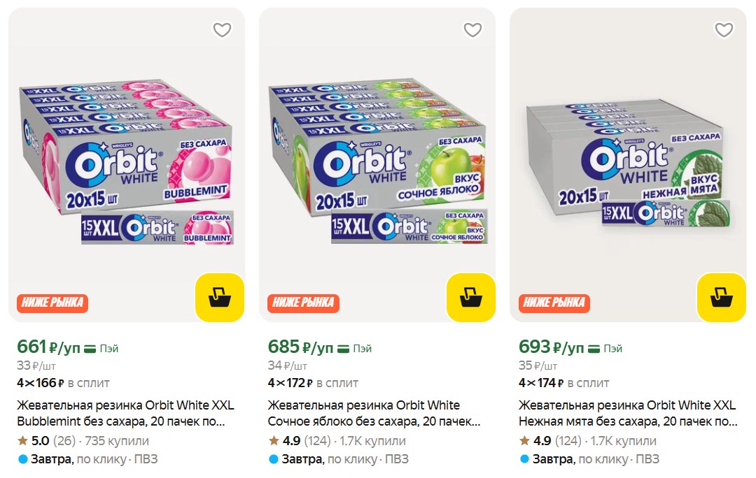 На Яндекс Маркете сейчас классная цена на Orbit White XXL - 693₽ за 20 пачек. Это практически опт, чтобы забыть про жвачку на полгода 😄