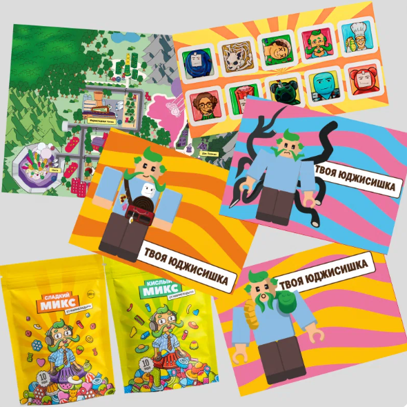 Внутри две пачки кислых и сладких мармеладок, карта их мира, письмо со стикерами и три секретных кода на скины: лакричное сухожилие, червяк Геннадий и сумчатая лакричка.