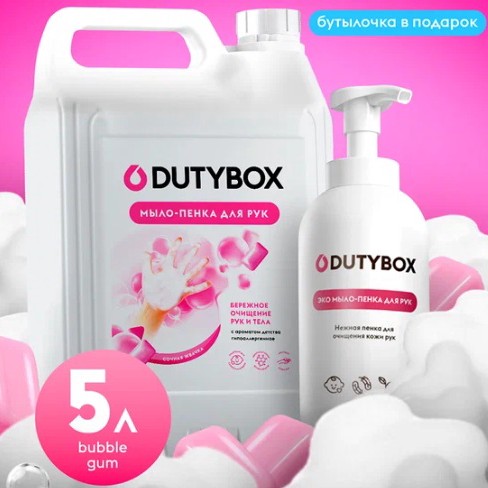 В наборе идёт пятилитровая канистра жидкого мыла и отдельная многоразовая бутылочка с дозатором, которую можно перезаполнять. У мыла приятный запах жвачки.