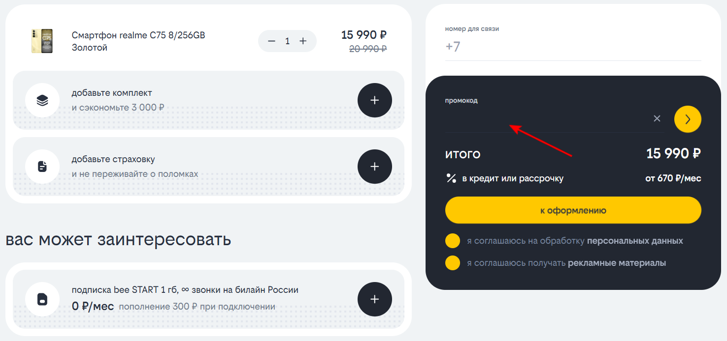 - Введите промокод в специальное поле