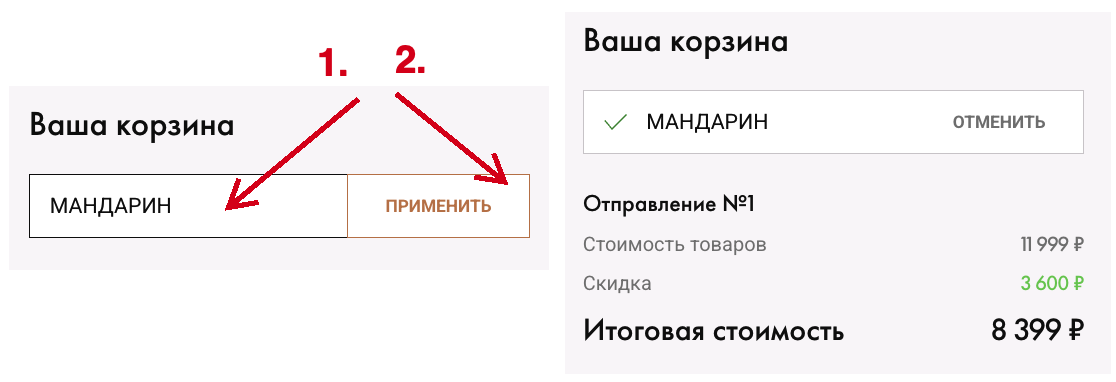 - Найдите блок «Промокод», введите его в специальное поле и нажмите на кнопку «Применить», цена должна измениться.