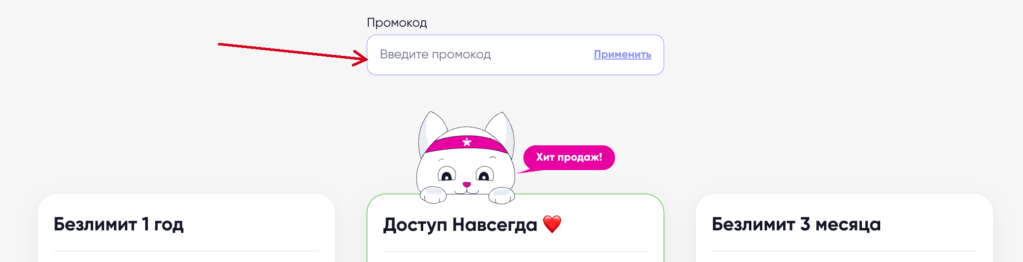 - Выберите тариф в соответствующем разделе и найдите поле «Промокод».