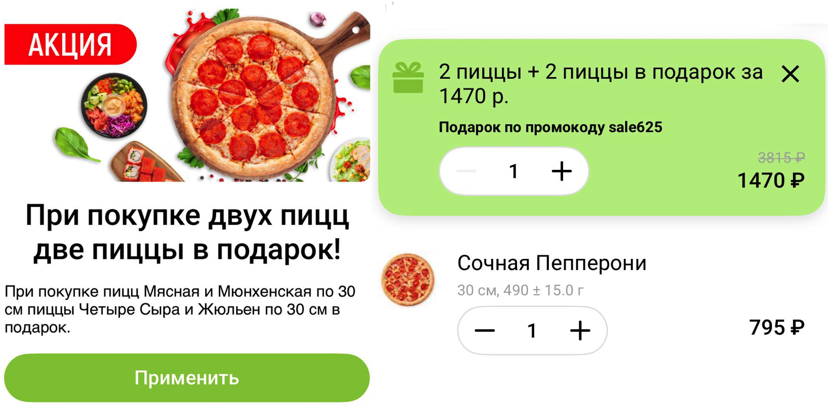 «Счастливые часы» для приложения по будням с 14:00 до 16:00. Выгода: нарастающая скидка на всё меню: