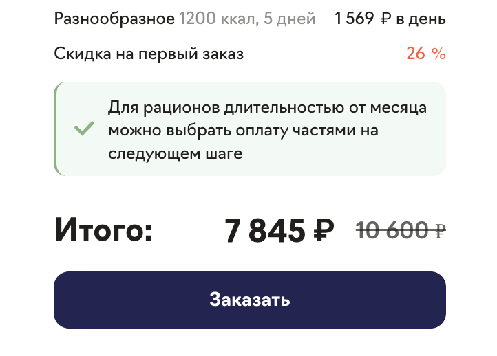 Калорийность на выбор - 1200, 1500, 2000 или 2500 ккал в день. Длительность: от одной недели до двух месяцев. Можно заказать еду только на будни, на будни с субботой или на всю неделю. Есть опция исключить рыбу из рациона. Для заказов от месяца доступна оплата частями.