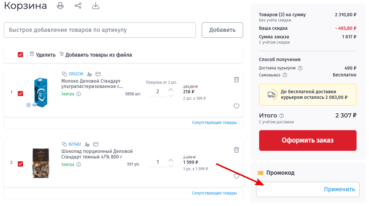 - Добавьте в корзину товары, которые планируете приобрести