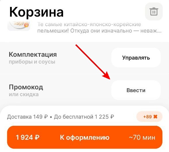 - В блоке «Промокод или скидка» нажмите кнопку «Ввести».
