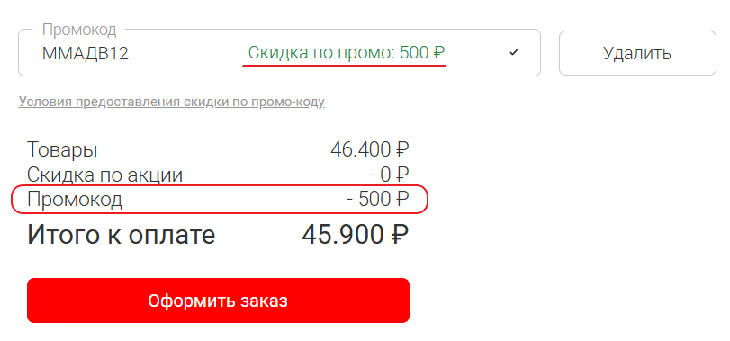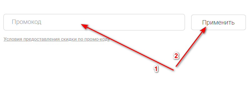 - В низу страницы найдите поле «Промокод», введите и примените его.