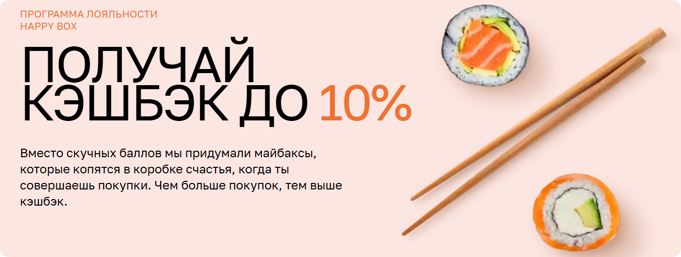 Основное преимущество программы - её практичность. Майбаксы (где 1 майбакс равен 1 рублю) можно копить и сразу использовать для оплаты до 30% стоимости нового заказа. Накопить их можно при любом заказе через приложение, сайт или в ресторане, предъявив QR-код. Система автоматически ежедневно пересчитывает ваш статус, повышая кешбэк с базовых 3% до максимальных 10%, как только сумма ваших покупок за два месяца превысит 7 999 рублей. Майбаксы хранятся на счету 180 дней, что даёт достаточно времени, чтобы воспользоваться накоплениями.