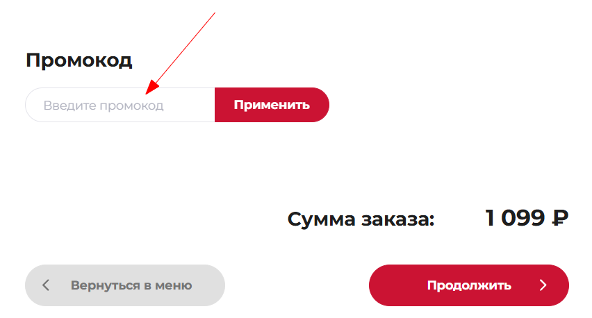 - Найдите специальное поле «Введите промокод» и нажмите кнопку «Применить».