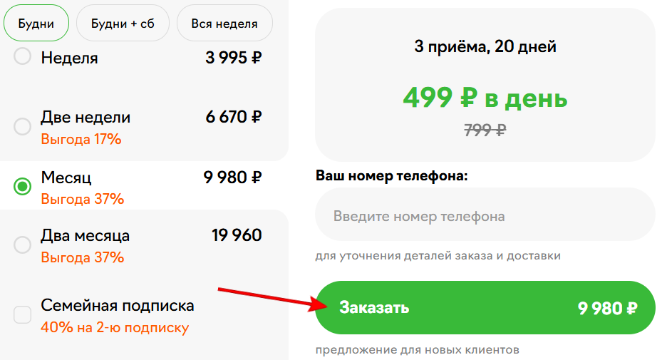 - Простота выбора: интуитивно понятный сайт и приложение позволяют легко оформить заказ, выбрать удобный тариф и дни доставки;