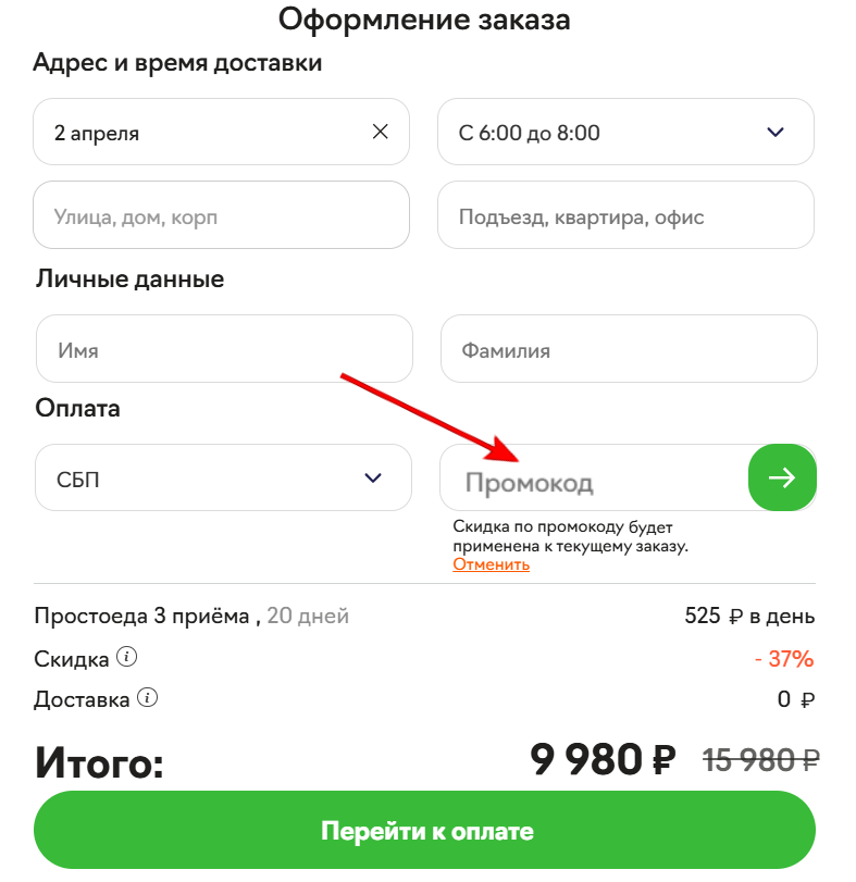 - Заполните личные данные и введите промокод в специальное поле