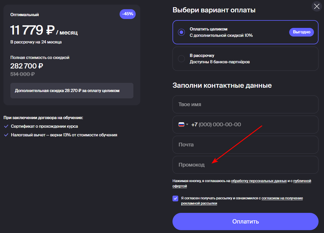- Нажмите кнопку «Записаться на обучение», в открывшемся окне найдите специальное поле «Промокод».