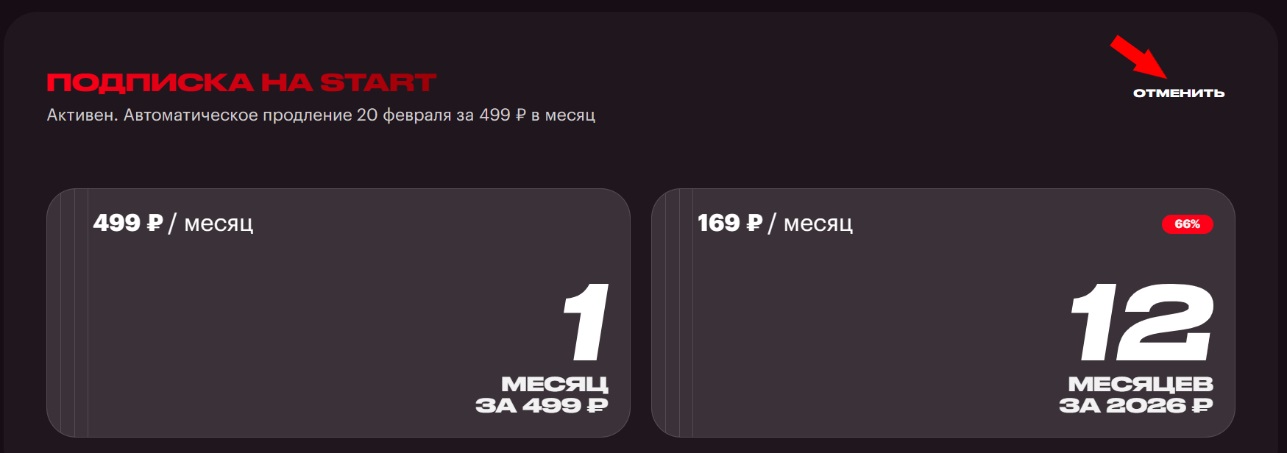 - При необходимости отключите автопродление на странице:https://start.ru/account/subscriptions