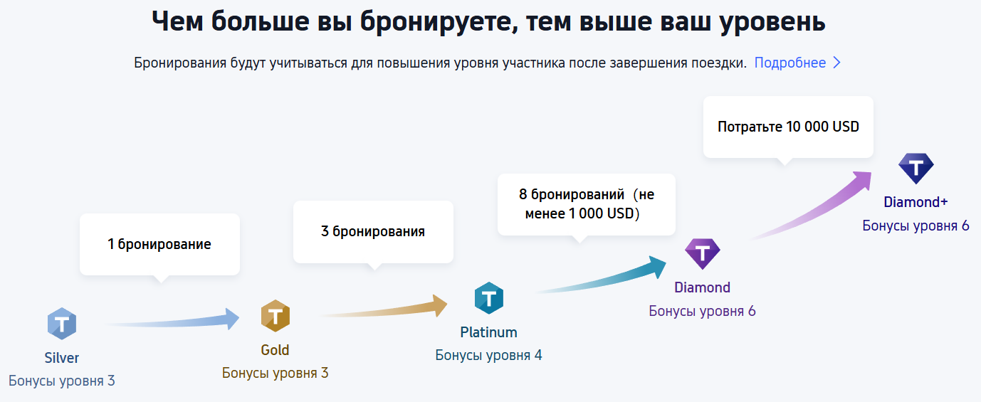 В сервисе действует собственная программа лояльности с системой уровней: Silver, Gold, Platinum, Diamond и Diamond+. Уровень повышается в зависимости от количества и суммы завершенных бронирований. Чем выше статус, тем больше привилегий: