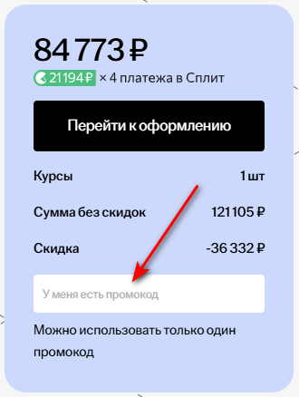 - Найдите специальное поле «У меня есть промокод», введите и примените его.