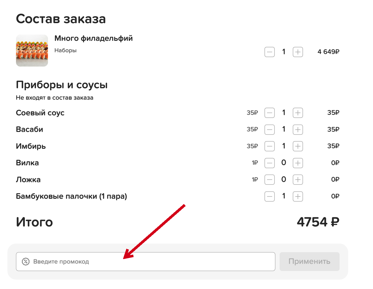 - Найдите поле «Введите промокод», примените код и цена должна измениться