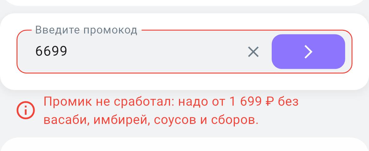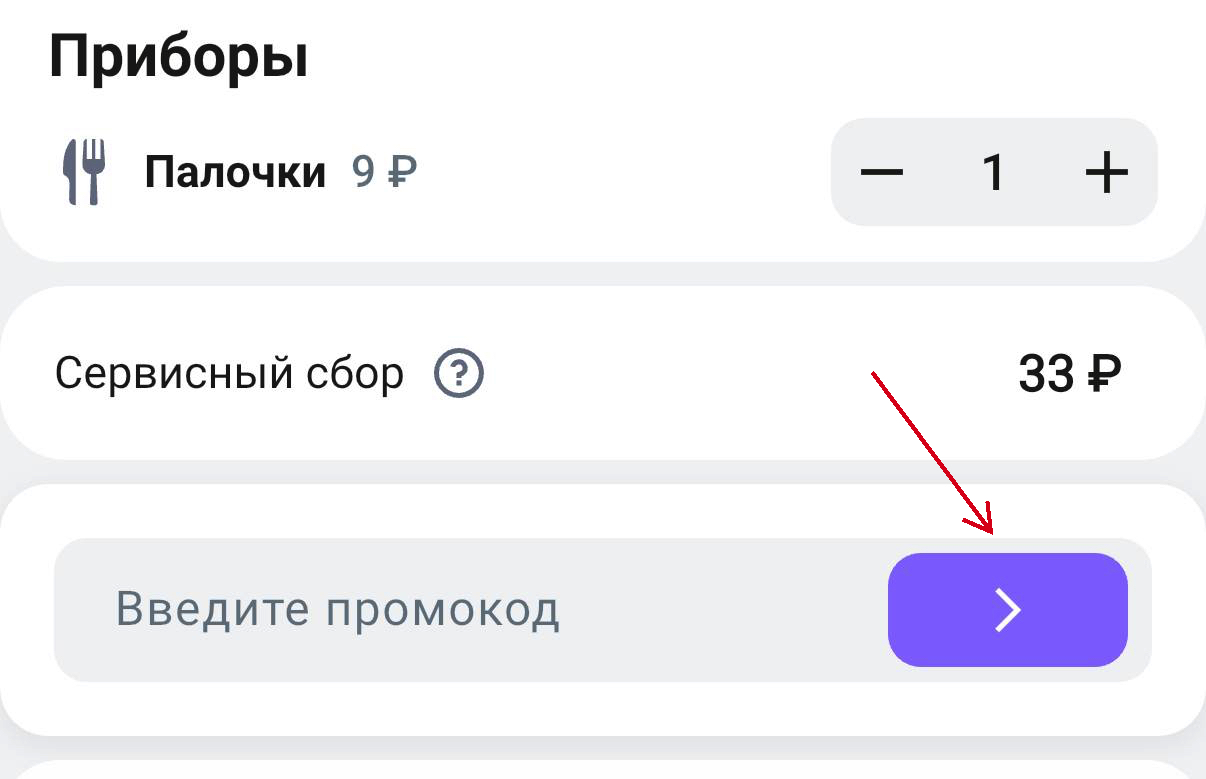 - Добавьте блюда в корзину, перейдите к оформлению заказа и введите промокод в специальное поле, затем нажмите на кнопку применения.