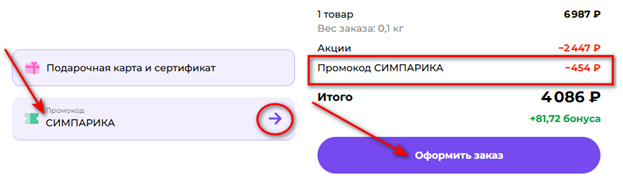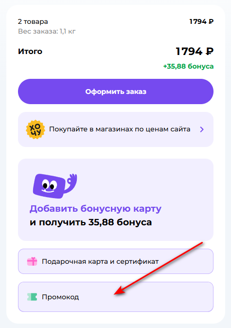 - Найдите специальное поле «Промокод» и введите в него промокод, цена должна измениться.